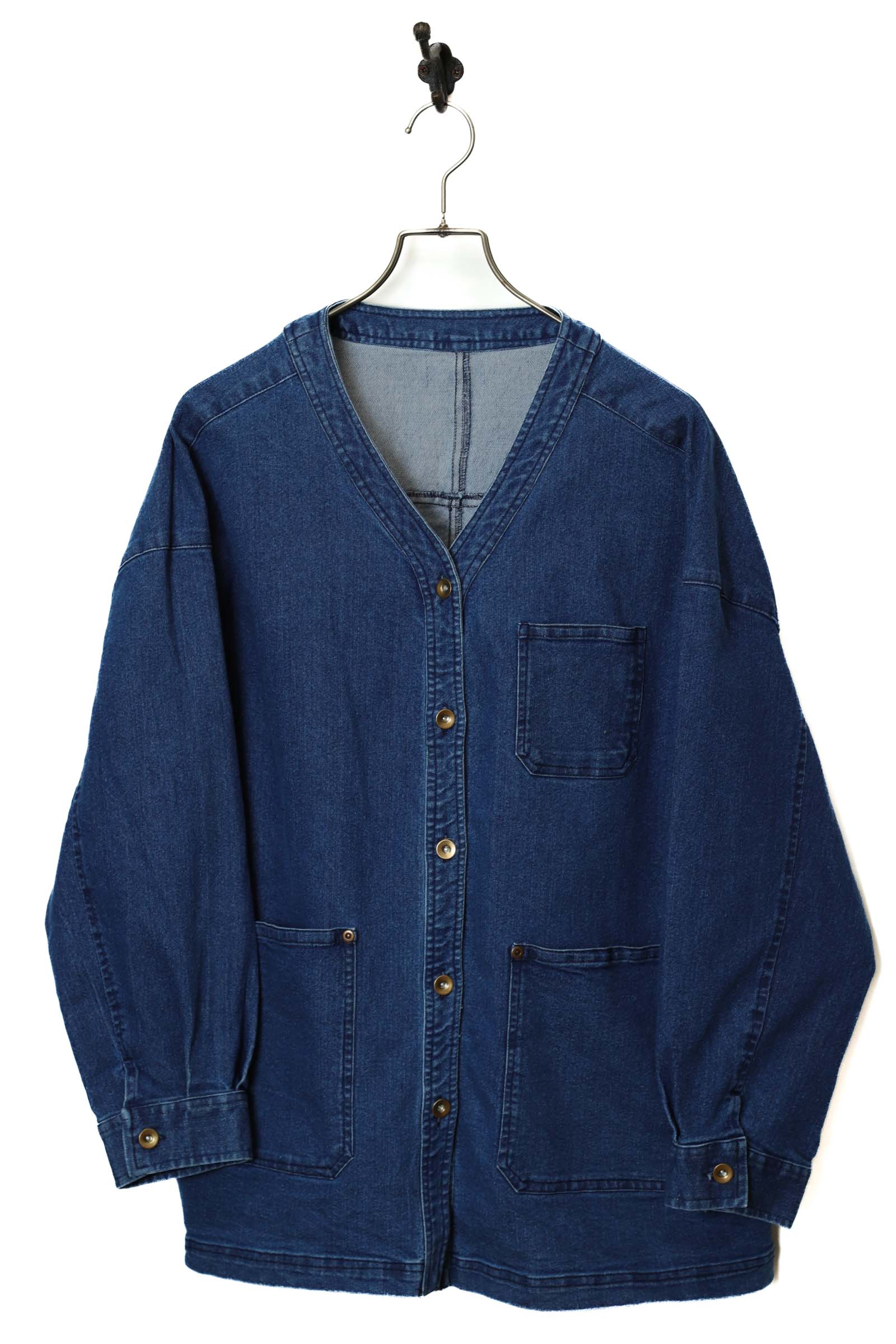 とてもお洒落なノーカラーデニムジャケット入荷しました!商品のコンディションはとても綺麗で、大きめのサイズ感でお洒落に着こなせます!こちらの商品は古着になります。古着の特性をご理解の上ご購入お願い致します。何でも気になる事ありましたら、ぜひご連絡お願い致します。